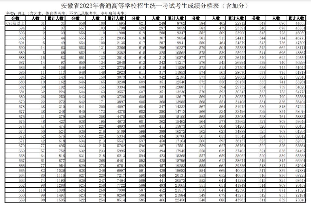 在安徽教育考试院公布了2023年安徽高考一分一段表之后,本文将及时更新。在此小编整理了2022年安徽高考一分一段表,供同学们参考,详情如下: