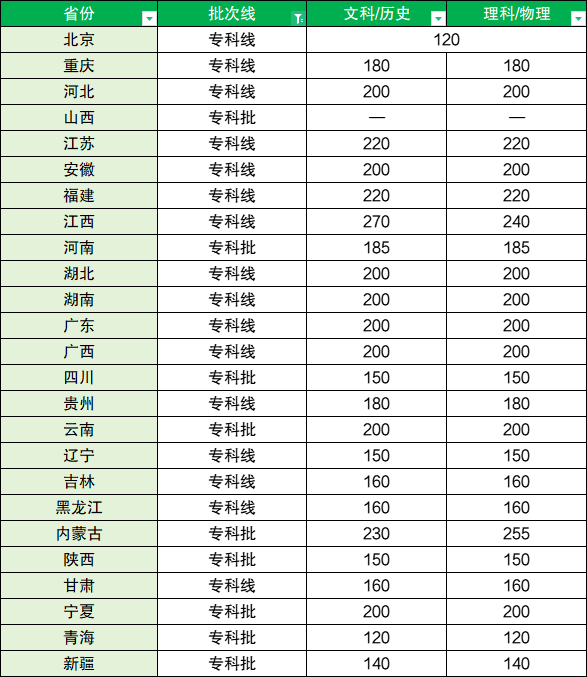 2024年大专录取分数线即为各省划定的最低录取控制线,最低分范围在120分~255分之间。