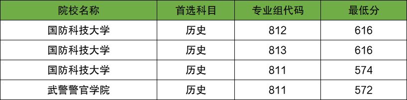 国防科技大学:历史类811组最低574分、812组最低616分、813组最低616分;