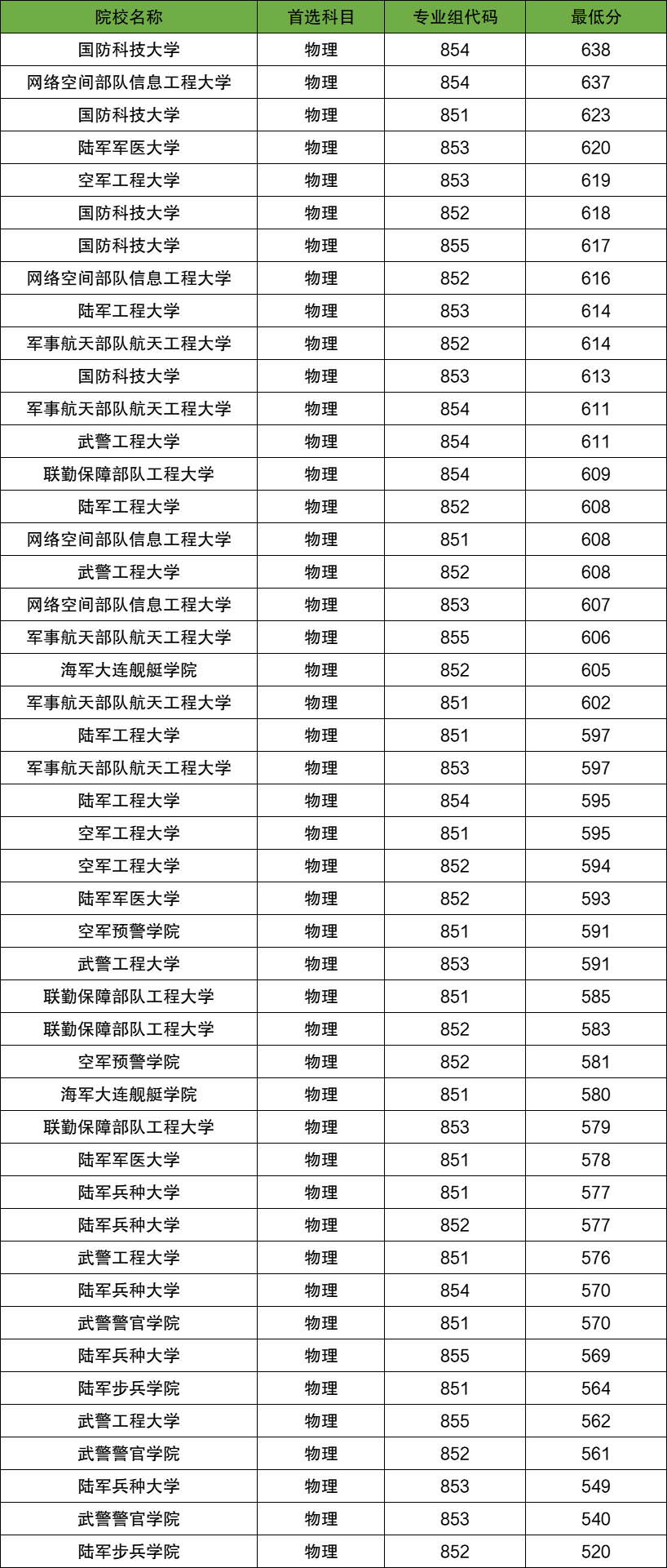 武警工程大学:物理类851组最低576分、855组最低562分。