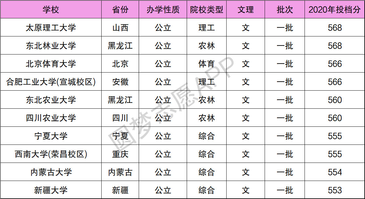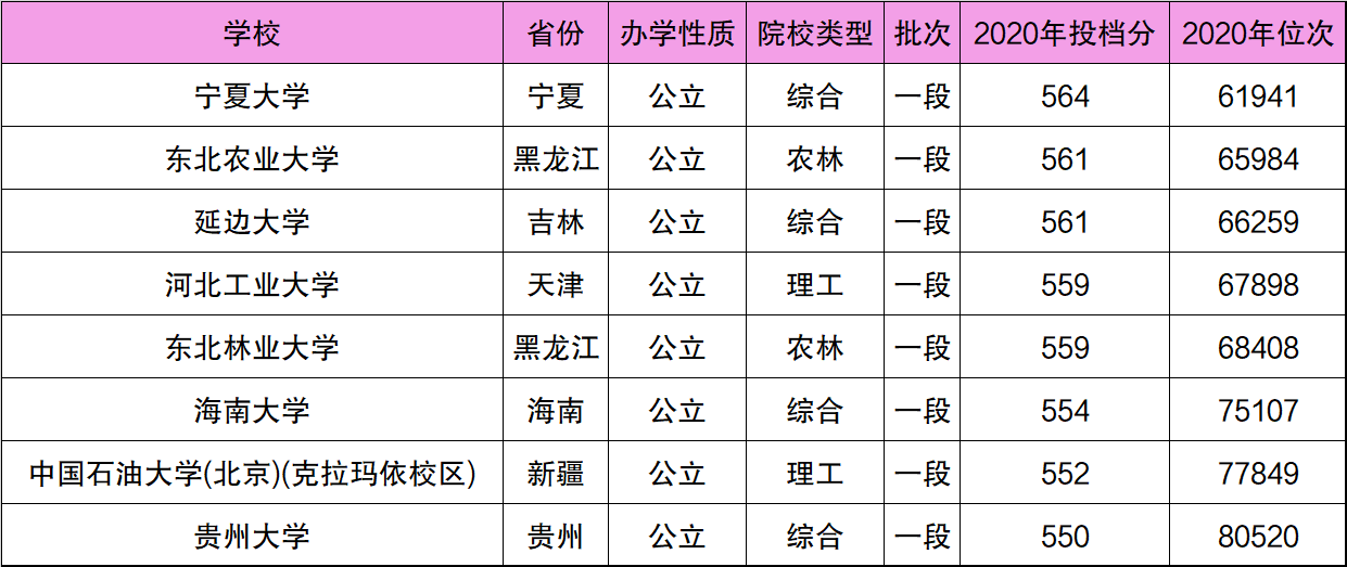 从上表可以看到,570分能报考的211大学大部分的实力在所有211大学里都会比较弱一些。比如宁夏大学、延边大学都是公认的“末流211”,且地理位置比较偏远。