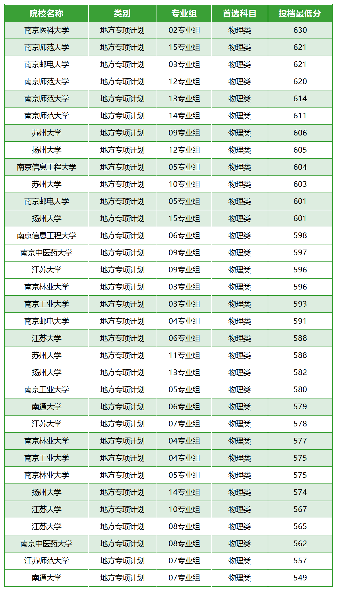 可以看出,在江苏省首选物理科目的最低分数达到549分才有资格进入地方专项计划的大学,对应学校是南通大学07专业组。而录取分数线最高的大学是南京医科大学02专业组,要求达到630分。因此可以得出结论,400多分是无法进入地方专项的。