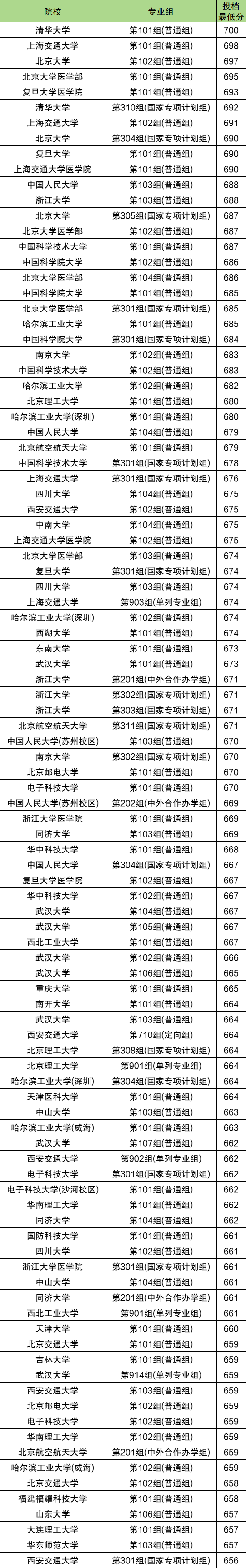 本科招生录取的大学中,录取分数线最高的是清华大学(第101组),2025年最低分是700分、位次是108名。分数线排名靠前的还有上海交通大学第101组(698分)、北京大学第102组(697分)、复旦大学医学院第101组(693分)等。