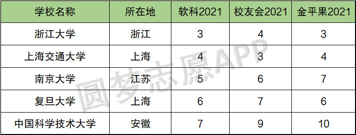 2021年,华东五校中,其中软科2021年和金平果2021年排名最高的是浙江大学,校友会排名最高的是上海交通大学;三个榜单中,排名相对靠后的是中国科学技术大学。