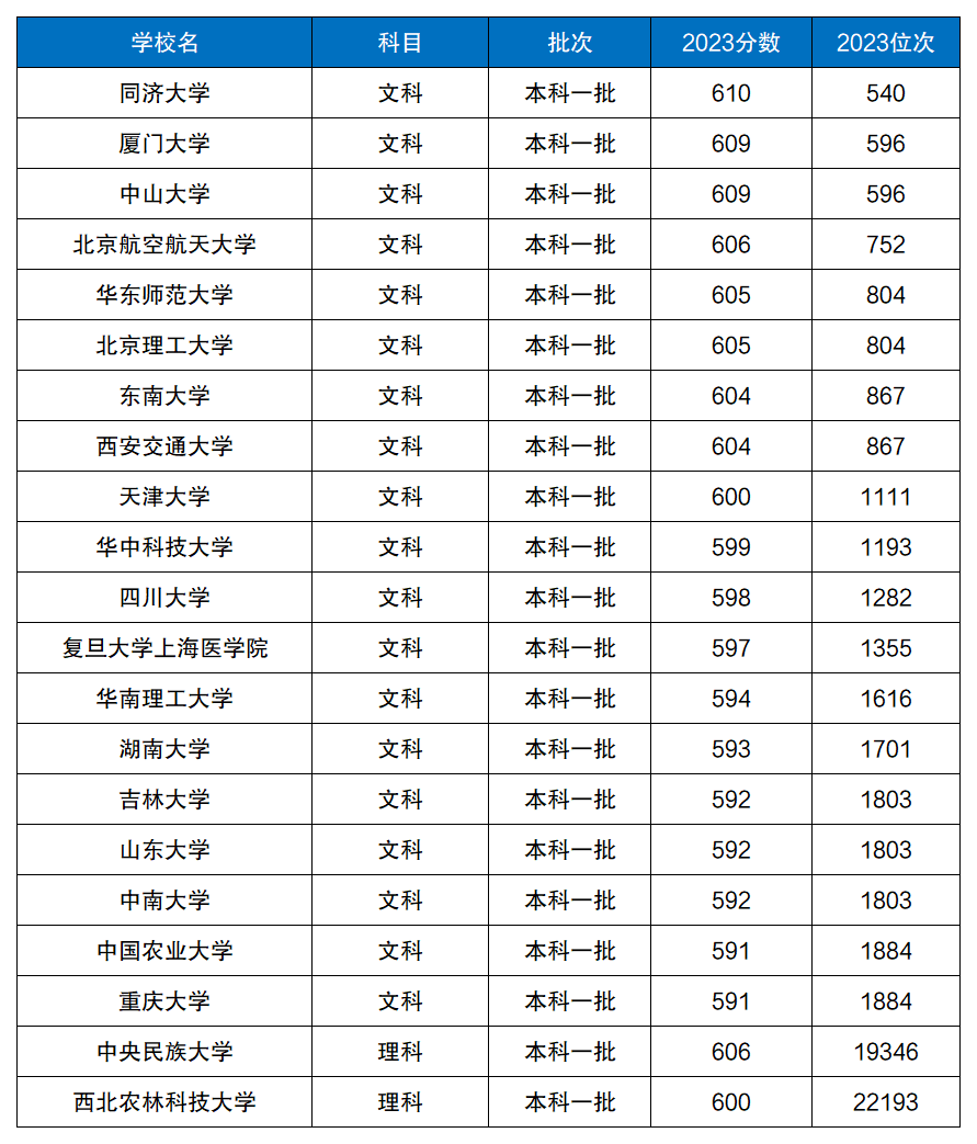 而文科考生考600分左右能够选择的985会更多一些,除了能选择中国农大(591分)、湖大(593分)这些排名相对靠后的院校,还能选择北航(606分)、同济(610分)这些顶尖院校。