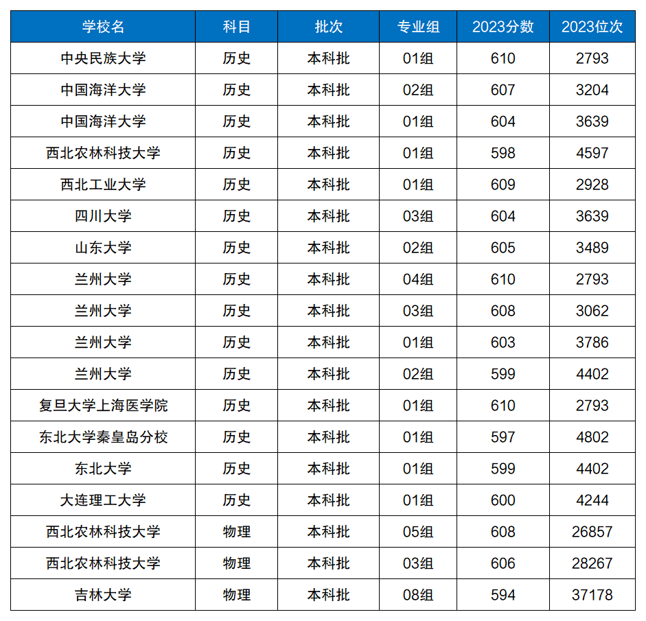 数据显示,2023年四川理科考生考600分左右能够选择的985院校数量相对较少,且院校特色比较明显,包括中央民族大学(606分)和西北农林科技大学(600分)等。