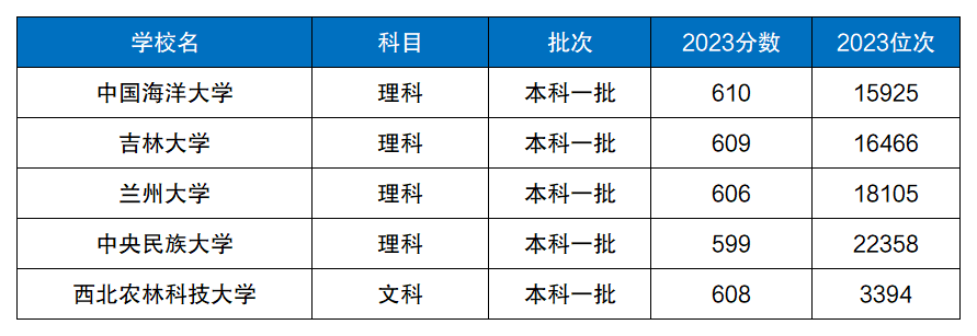 如文科生600分左右能报考的985有西北农林科技大学(608分)等,理科生600分左右能报考的985有中国海洋大学(610分)、吉林大学(609分)等。