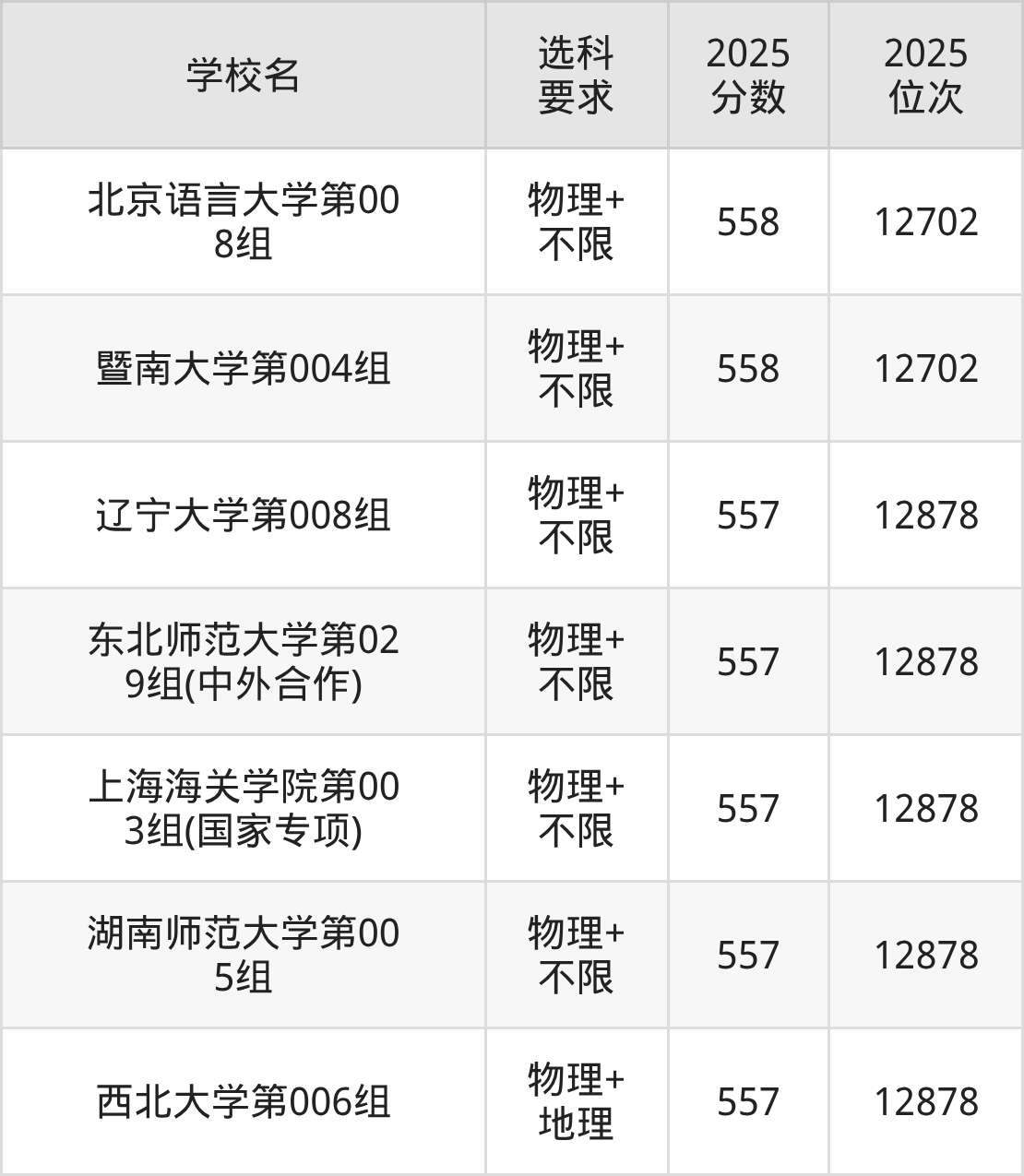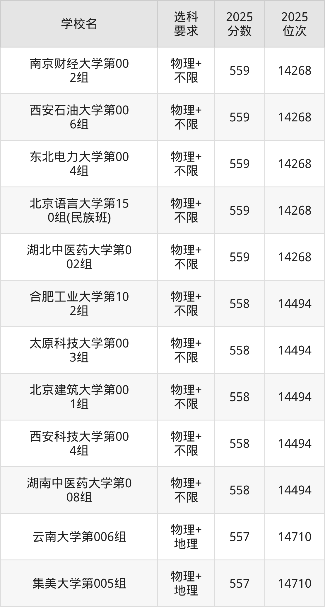 | 学校名 | 专业组 | 选科 要求 | 2025 分数 | 2025 位次 |