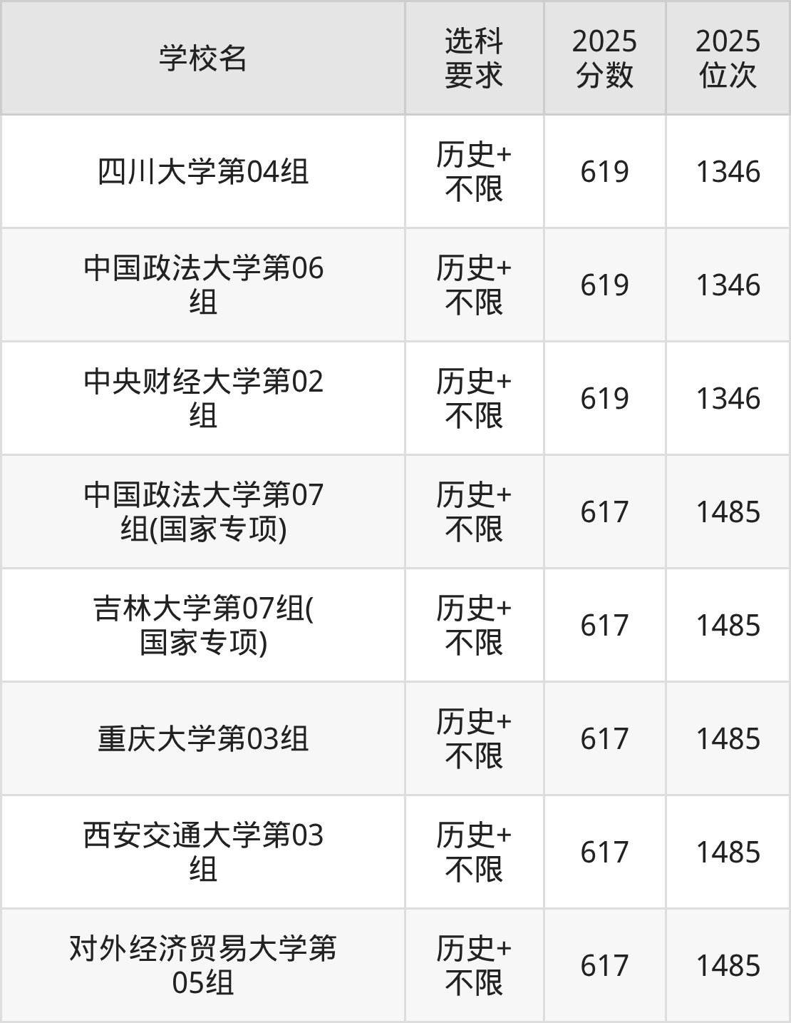 | 中国政法大学 | 719组 (预科) | 历史+ 不限 | 619 | 491 |