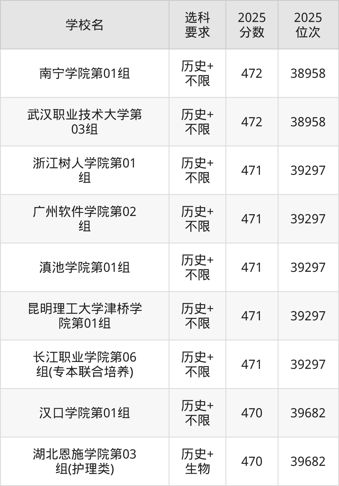 | 学校名 | 专业组 | 选科 要求 | 2025 分数 | 2025 位次 |