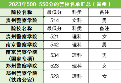 贵州500-550分可报考的警校有3所,共计有6个招生单位,其中面向文科招生的仅有1个,面向理科招生的有6个。
