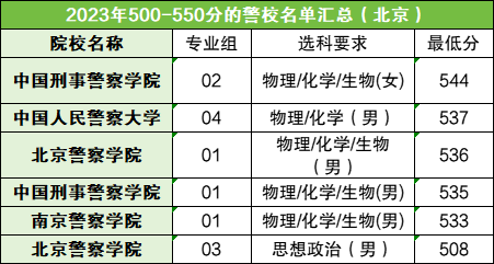分数在540分以上的专业组有1个,对应的是刑警学院02组(544分),仅面向女生招生。招生线最低的是北京警院03组,分数是508,仅面向男生招生。