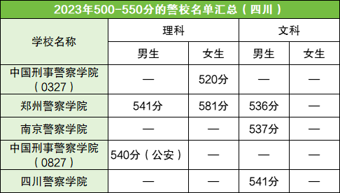 在文科方面,分数在550分以下的院校都只招收男生,其中分数要求最高的是四川警院(541分)。