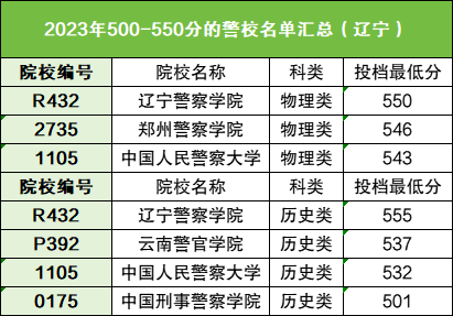 以辽宁2023年的招生数据为例,500-550分可以上的警校有辽宁警院、郑州警院、警大、云南警院、刑警学院。关于更多省市500-550分可以上的大学,小编都在本文进行了整理,供查阅。