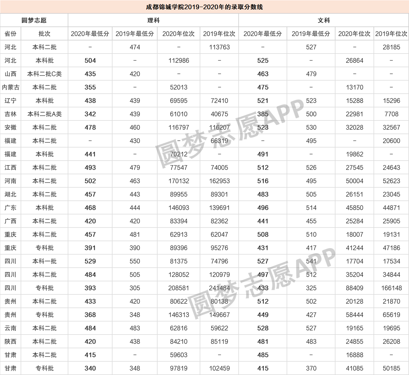 小编根据各省教育考试院公布的招录数据,为大家整理出成都锦城学院在普通省份2019年和2020年的录取分数线,供2021年考生参考。