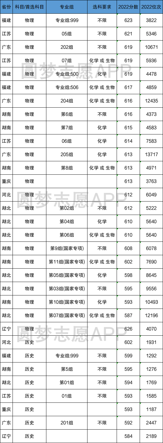 在采取“3+1+2”模式的8个省份中,华南理工大学在首选物理的批次中录取分数最高的是辽宁(626分,4070名),录取分数最低的是湖北(587分,12196名)。首选历史的录取分数线最高的是河北(602分,1931名),录取分数最低的是辽宁(584分,2189名)