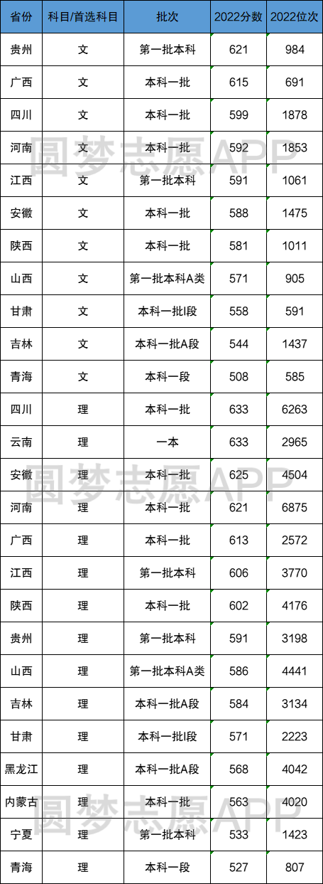 在沿用旧高考模式的15个省份中,华南理工大学文科录取分数线最高的是贵州(621分,984名),录取分数线最低的是青海(508分,585名)。理科录取分数线最高的是四川(633分,6263名),录取分数线最低的是青海(527分,807名)。