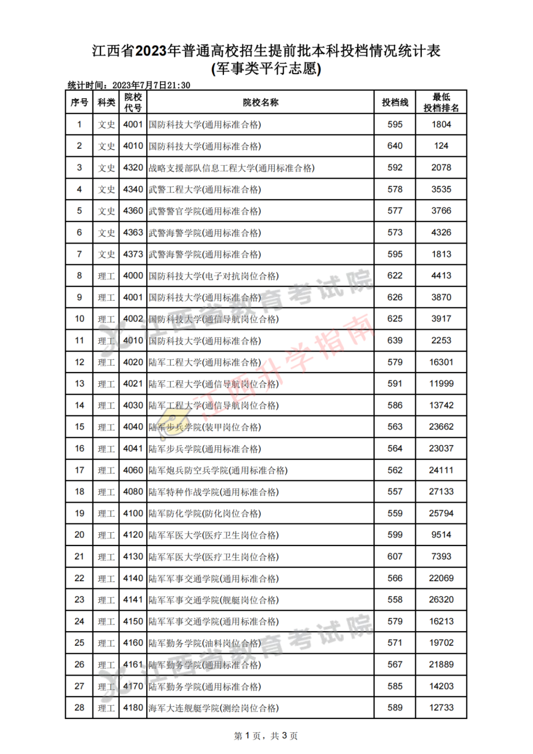 2023江西军校录取分数线一览表: