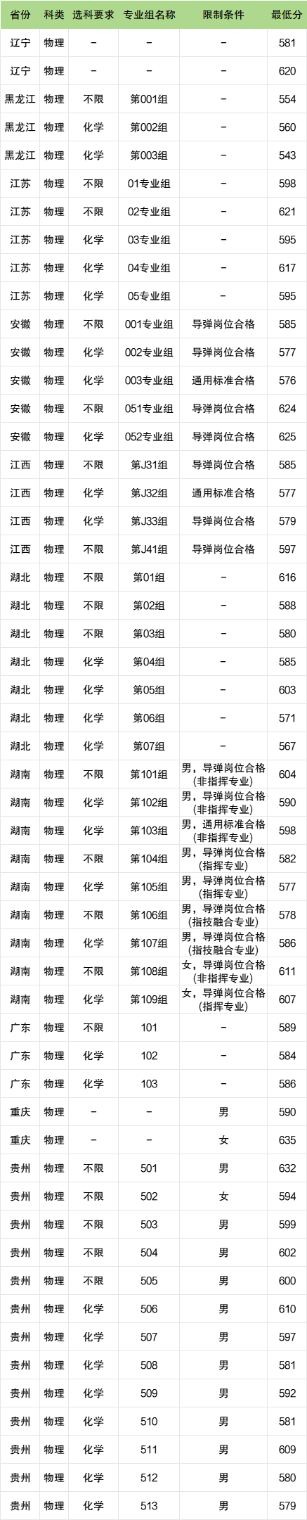 比如在北京,火箭军工程大学录取最低分是545分,但这只是在选考物理和化学的男生中最低分,如果是选考物理科目的女生的话最低分可达566分。