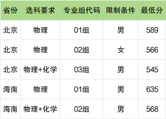录取分数线最低是在北京:选考物理+化学545分(男)、选考物理566分(女)。