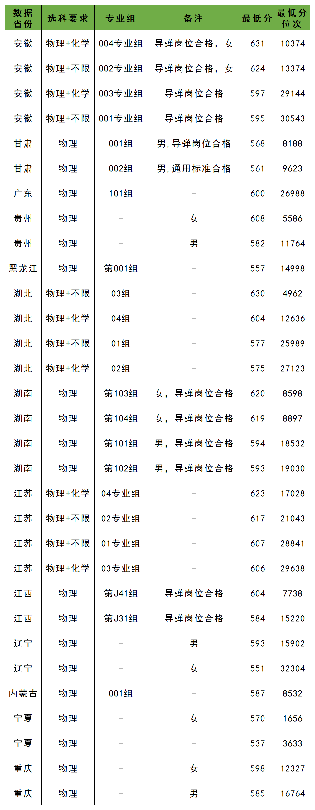 比如在湖南,火箭军工程大学录取最低分是593分,但这只是物理类男生的最低分,如果是物理类女生的话,最低分可达619分。