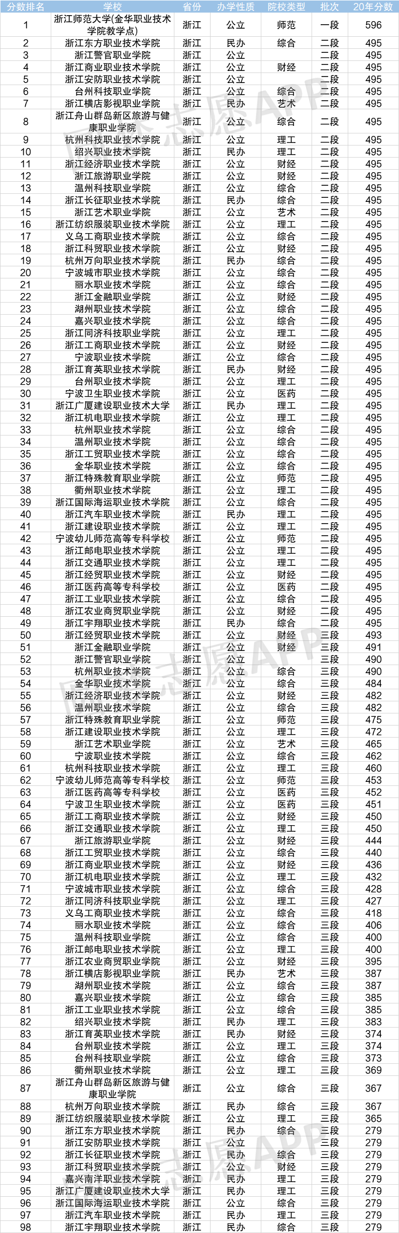 (本文所有分数均为各校2020年在浙江省的录取分数,同年该省专科批省控线
