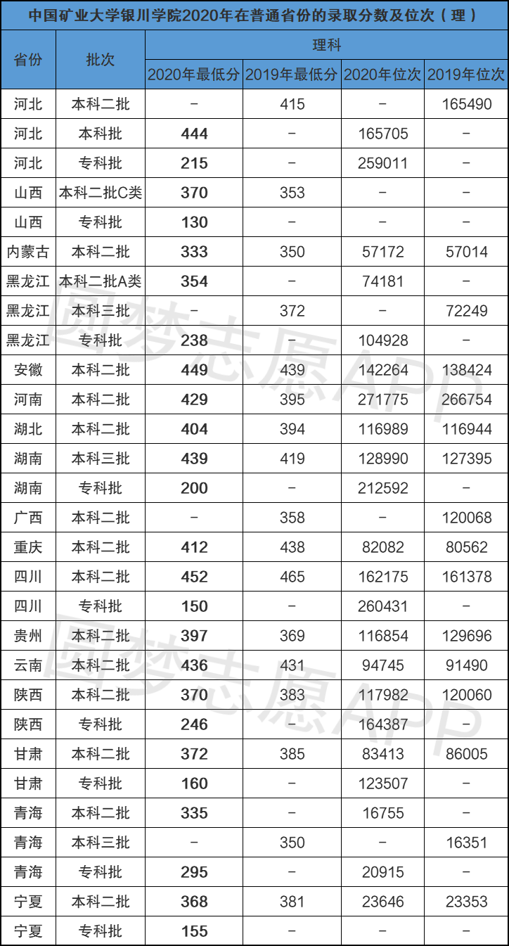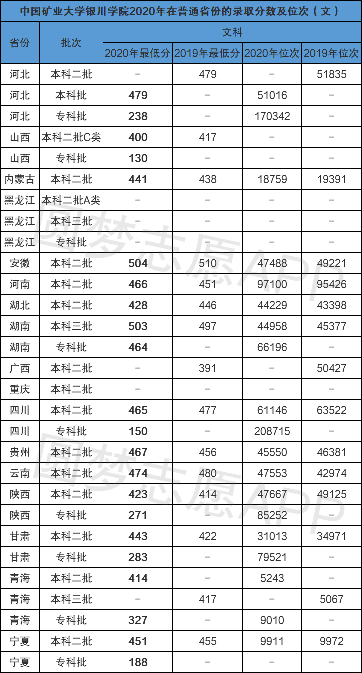 由于银川科技学院才由教育部拟同意转设,现在还没有录取的相关情况。但银川科技学院是由中国矿业大学银川学院转设而成的,我们可根据中国矿业大学银川学院历年的录取分数线来做一个参考,以下2020年中国矿业大学银川学院在全国各省市文科及理科的最低录取分数线及位次排名,供大家参考: