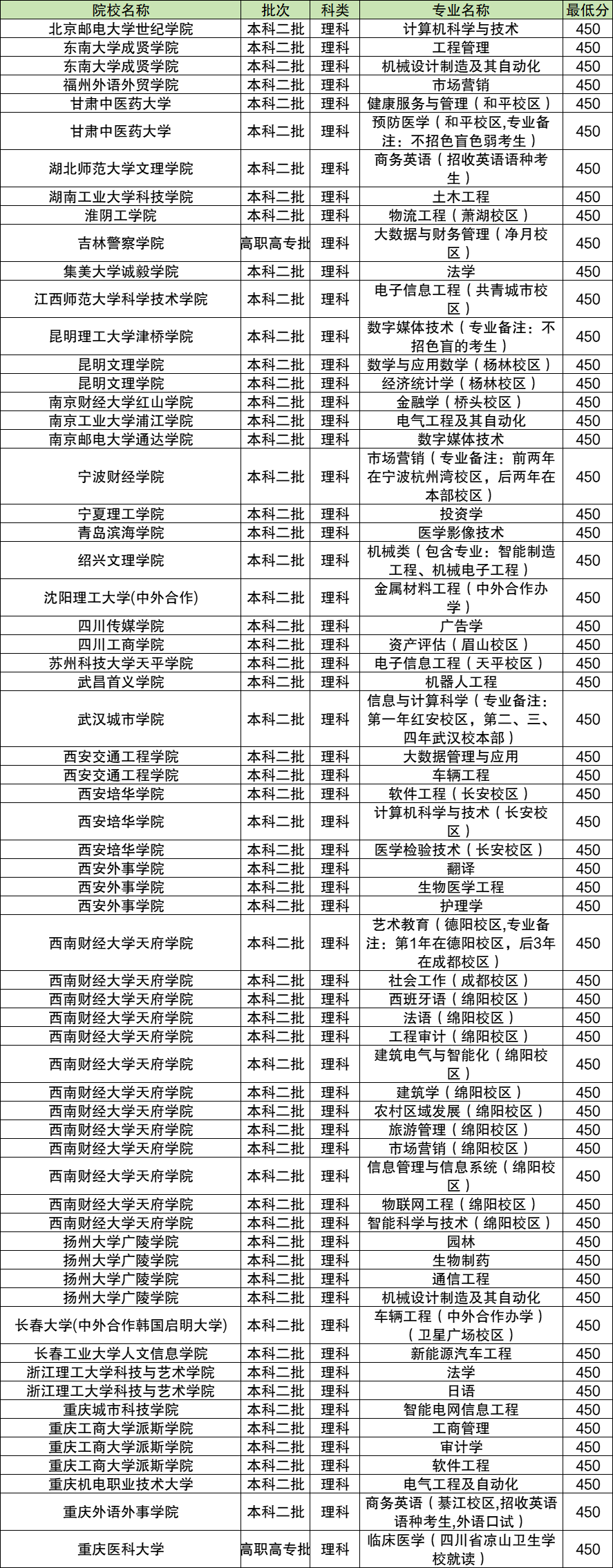 从全国大学四川省高考的分数来看,450分的理科考生能报考的专业,以及对应的学校如下表: