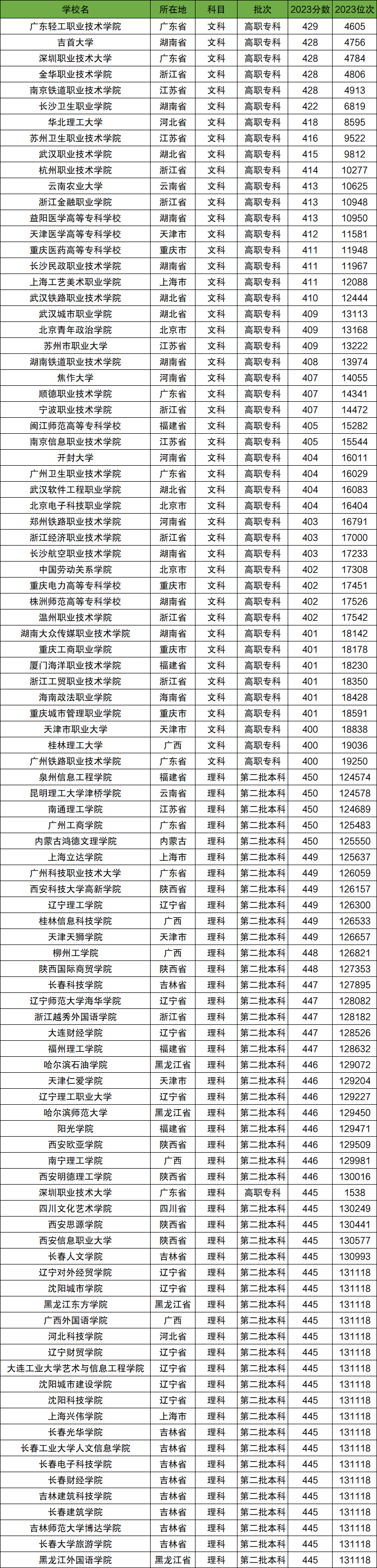 下表为2023年全国大学在江西高考中,录取分数在400分的大学名单。