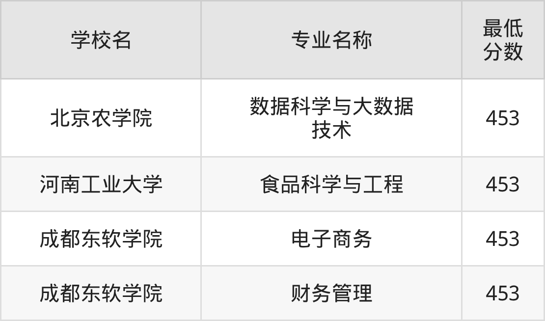 453分对应的最低位次是41804。能上的理科大学有3所,包含:河南工业大学(食品科学与工程专业最低分是453分,是国家一流本科专业、学费18000元)、北京农学院(数据科学与大数据技术专业最低分是453分,学费4600元)、成都东软学院(电子商务专业最低分是453分,学费19080元)。