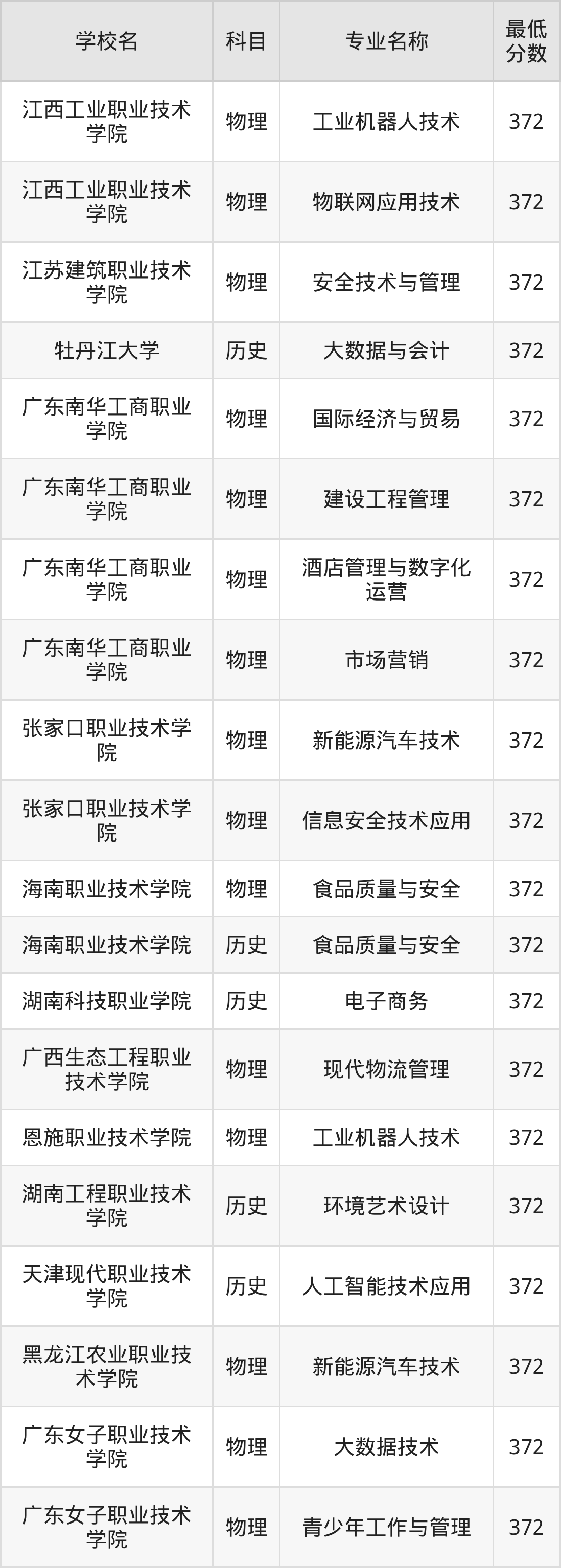 | 黑龙江旅游职业技 术学院 | 电子商务 | 物理 | 372 |