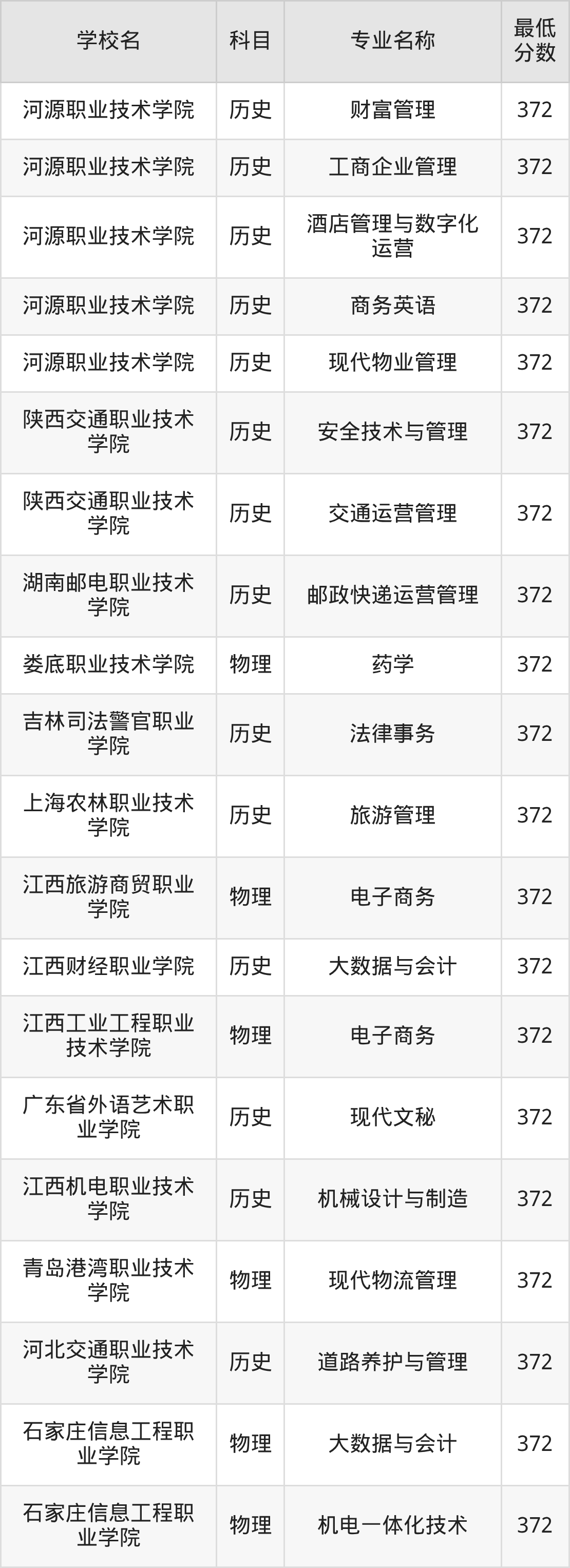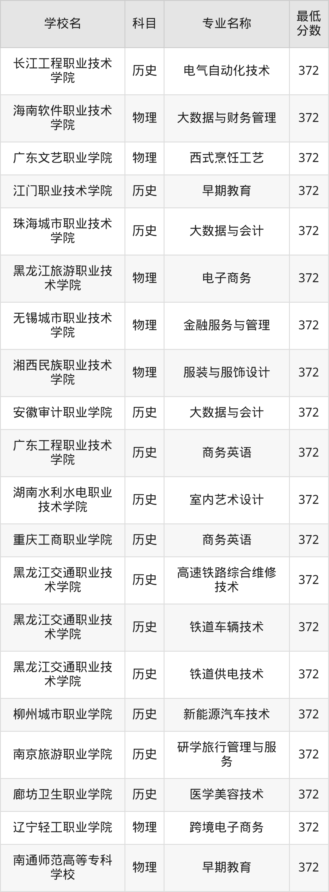 下方表格展示的是广东高考372分对应的全部公办大专学校名单: