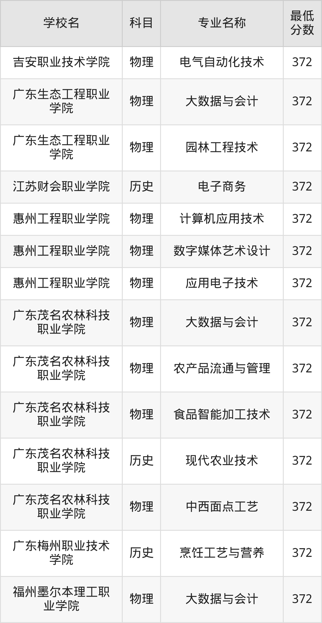| 惠州工程职业学院 | 计算机应用技术 | 物理 | 372 |