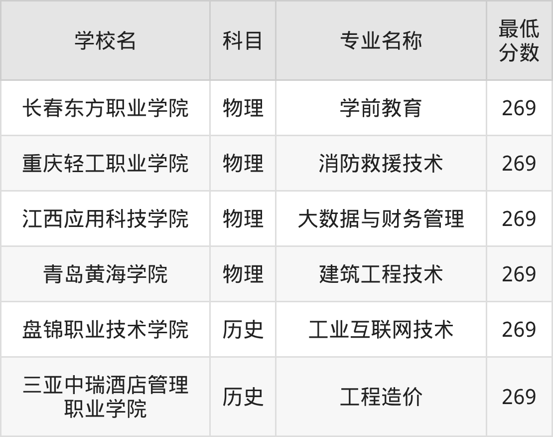 能上的专业有4个,包含冷门专业:学前教育(269分可读长春东方职业学院)、建筑工程技术(269分可读青岛黄海学院)。