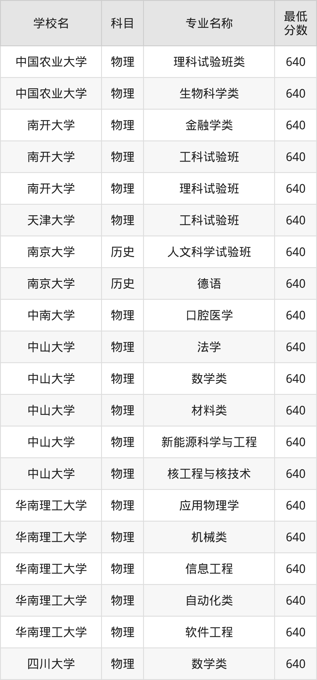 | 华南理工大学 | 应用物理学 | 物理 | 640 |