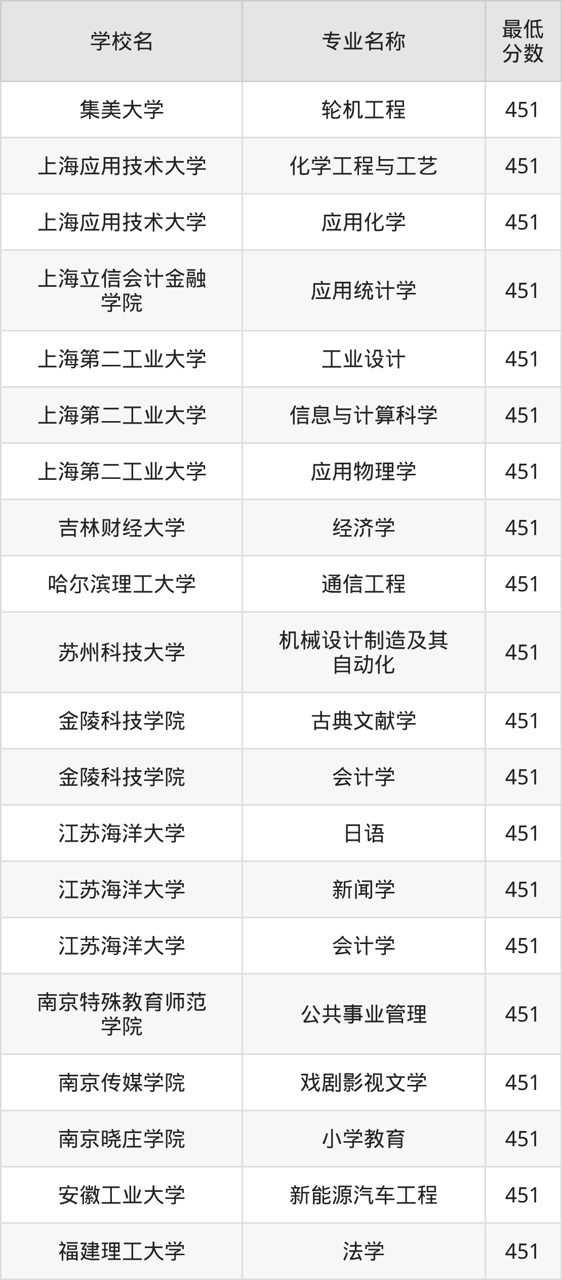 下方表格展示的是上海高考451分对应的全部本科大学名单: