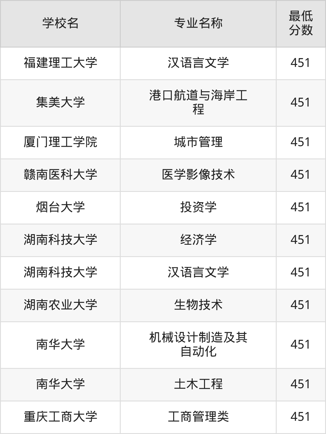 451分对应的最低位次是37914位,能上的本科大学有8所,包含湖南科技大学(经济学、国际经济与贸易、思想政治教育是国家一流本科专业)、上海立信会计金融学院(位于上海市,有硕士点,王牌专业是金融学、金融工程、国际经济与贸易等专业)。