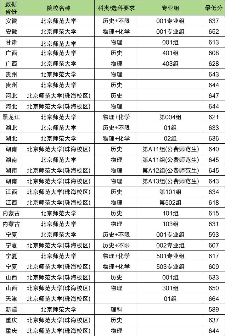 2025年北京师范大学国家公费师范生录取分数线公布:湖南最低历史类640分、物理类643分;广西最低历史类608分、物理类628分;安徽历史类637分、物理类652分等。