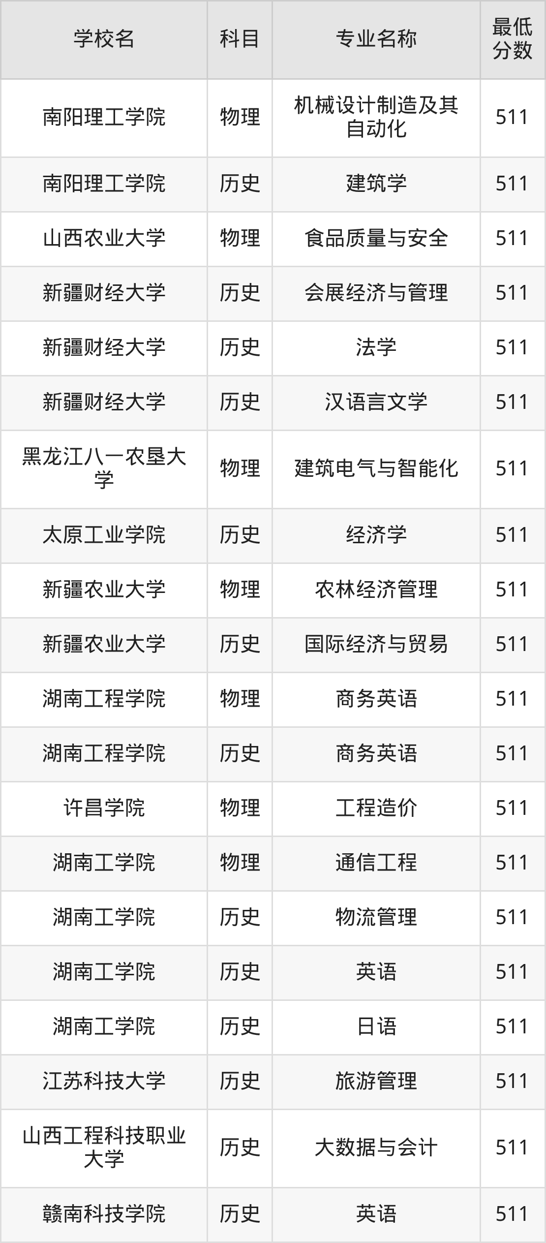 | 湖南工学院 | 英语 | 历史 | 511 |