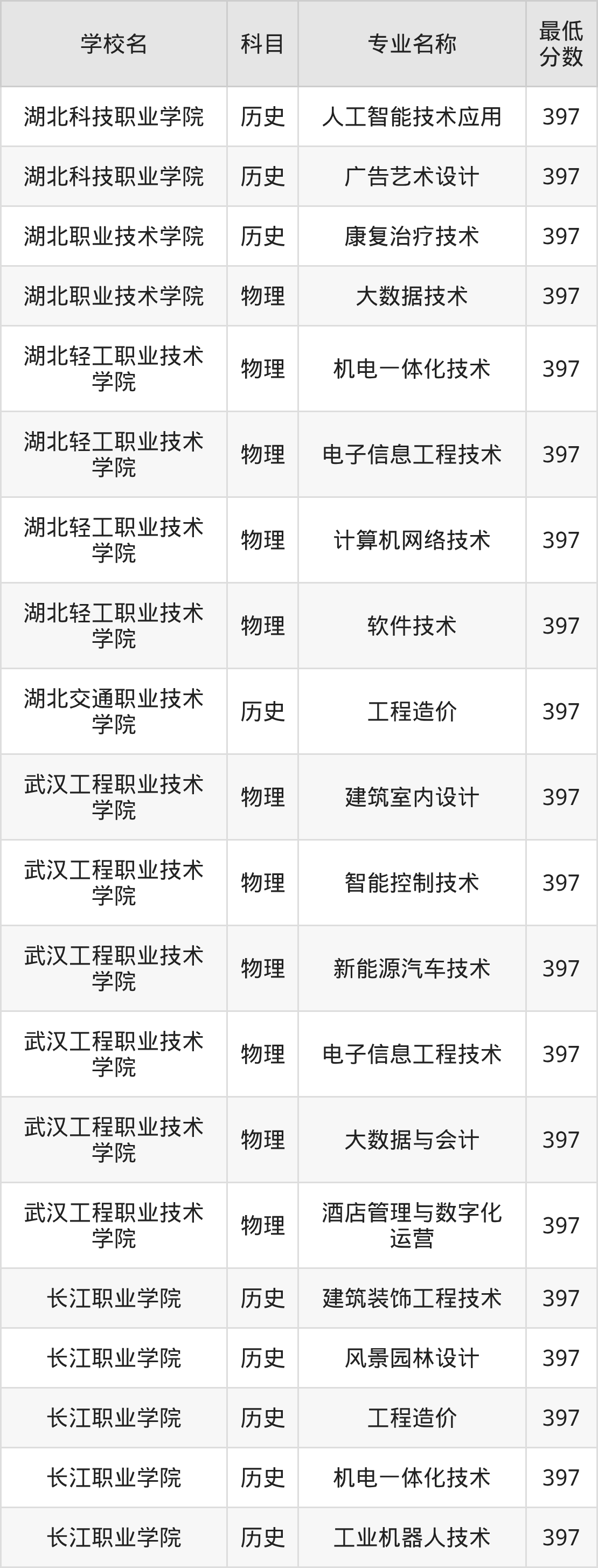 | 湖北交通职业技术 学院 | 工程造价 | 历史 | 397 |