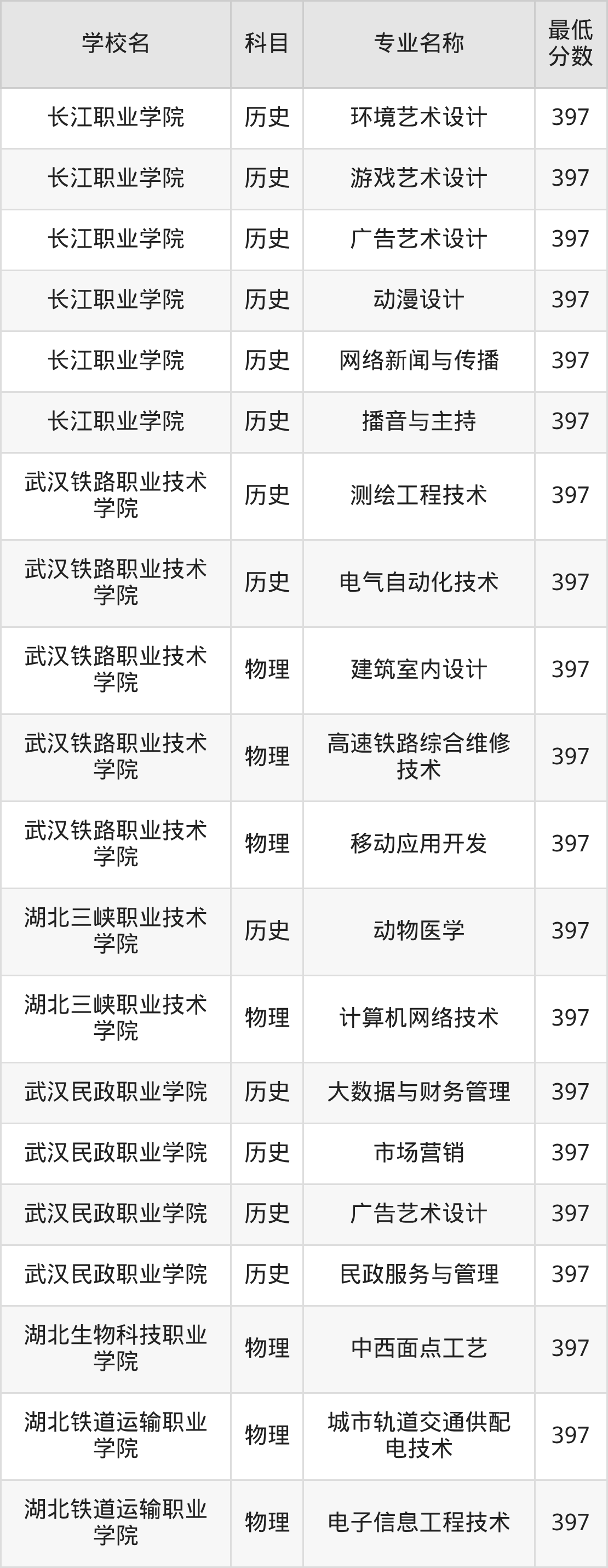 下方表格展示的是湖北高考397分对应的全部公办大专学校名单: