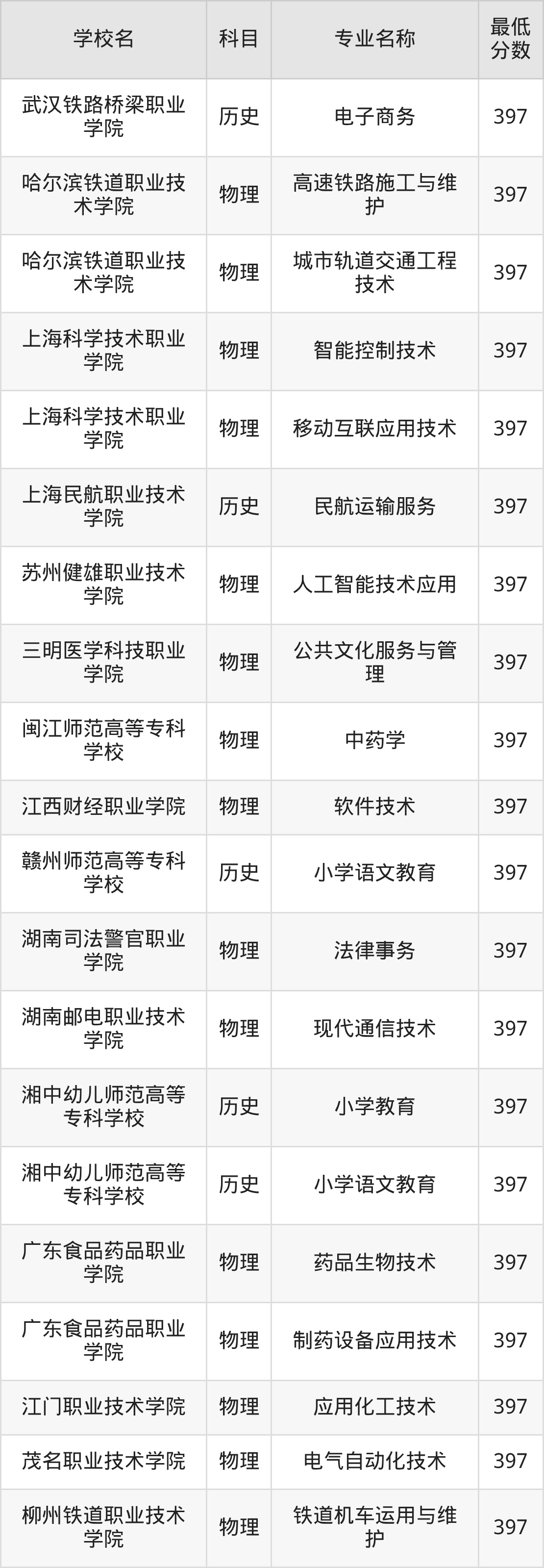 | 哈尔滨铁道职业技 术学院 | 城市轨道交通工程 技术 | 物理 | 397 |