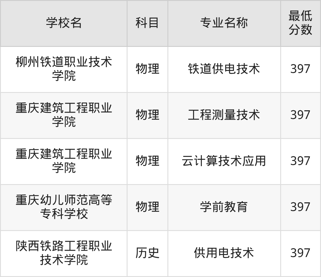 | 柳州铁道职业技术 学院 | 铁道供电技术 | 物理 | 397 |