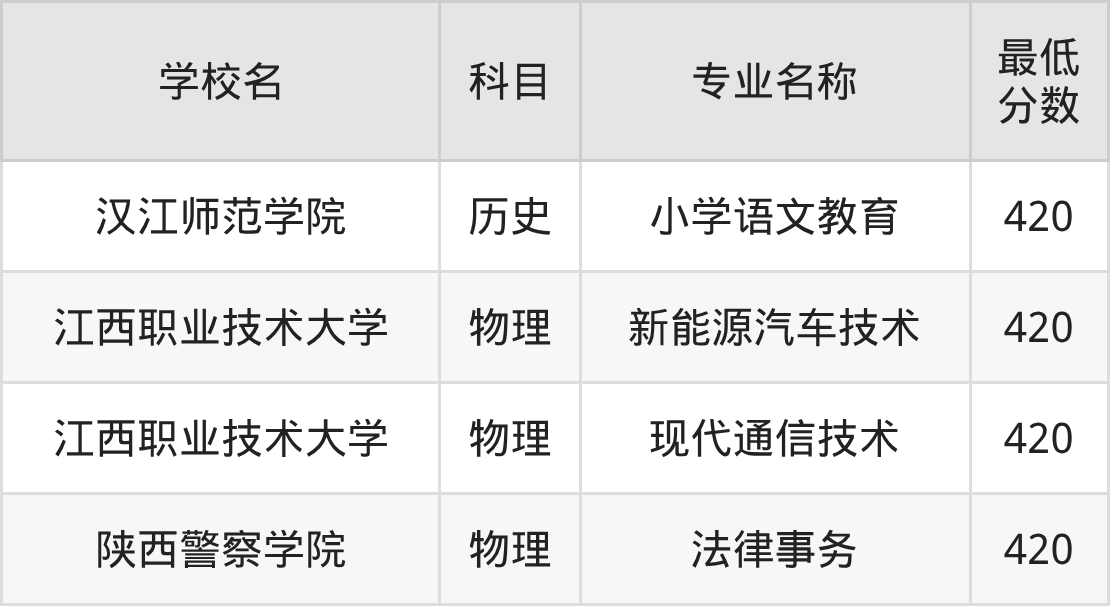 能上的专业有3个,包含热门专业:新能源汽车技术(420分可读江西职业技术大学)、法律事务(420分可读陕西警察学院)等专业。