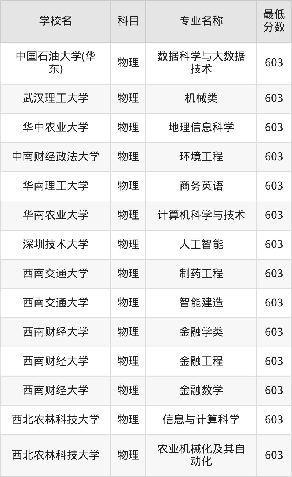 | 西南财经大学 | 金融工程 | 物理 | 603 |