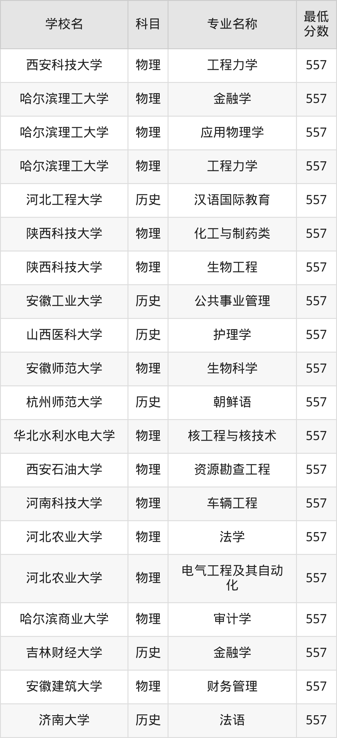 下方表格展示的是河北高考557分对应的全部好大学名单: