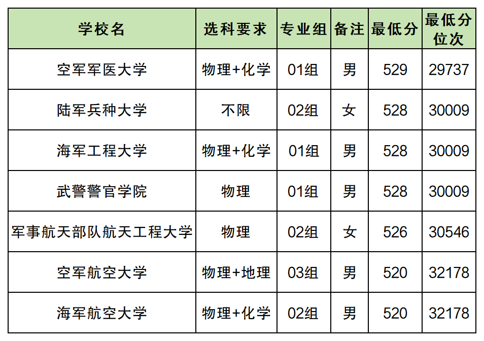 2025年贵州物理类500分到530分的军校共有1所,为海军军医大学,只招收男生,2025年最低分为504分。