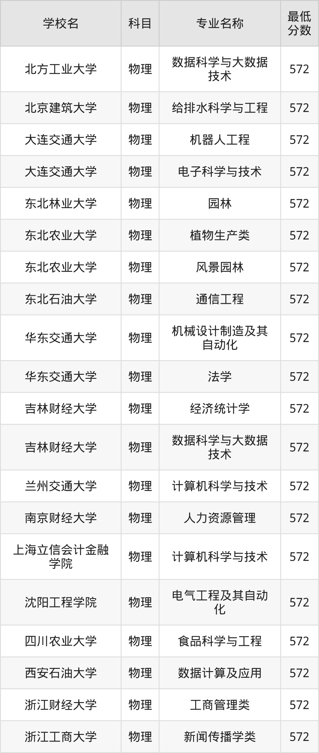 最低分为572分的理科大学有26所、专业有26个。