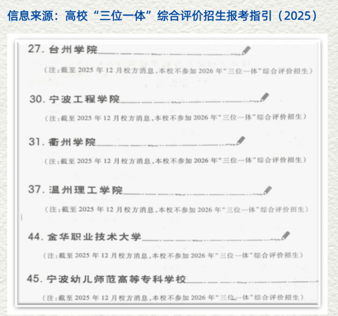 注:湖州学院、台州学院、衢州学院、宁波工程学院、温州理工学院、金华职业技术大学、宁波幼儿师范高等专科学校等7所高校已明确表示不参加2026年浙江省属三位一体招生。