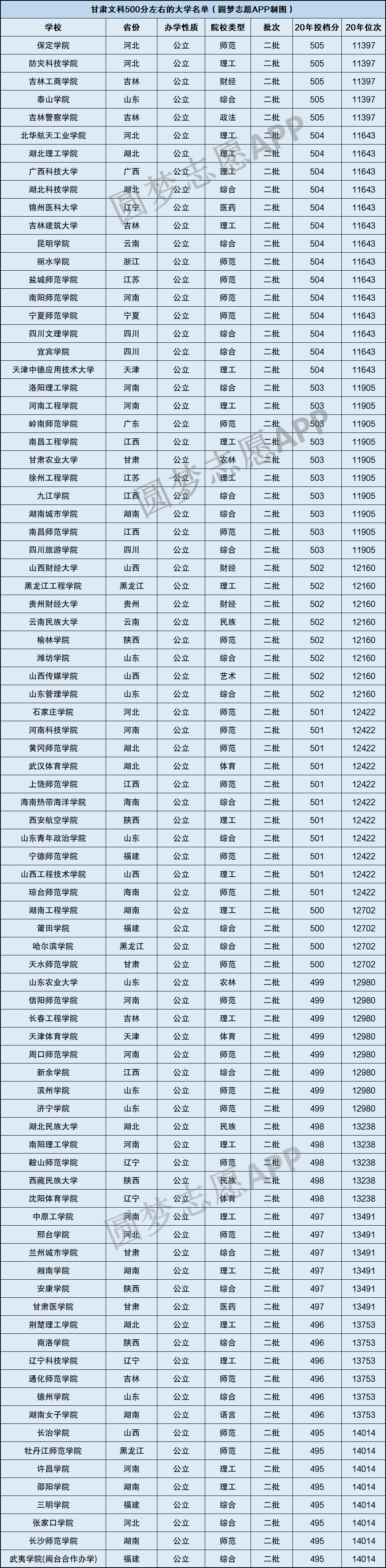 根据2020年甘肃省教育考试院公布的具体招录数据,小编整理出了甘肃省文科500分左右(495-505分)能考取的大学,具体名单如下: